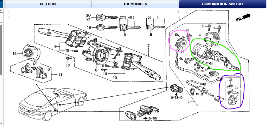 You can replace the lock cylinder (green circled) and/or the ignition switch (pink circled) without damaging the immobi unit (purple circled) - it just screws onto the end of the lock cylinder.