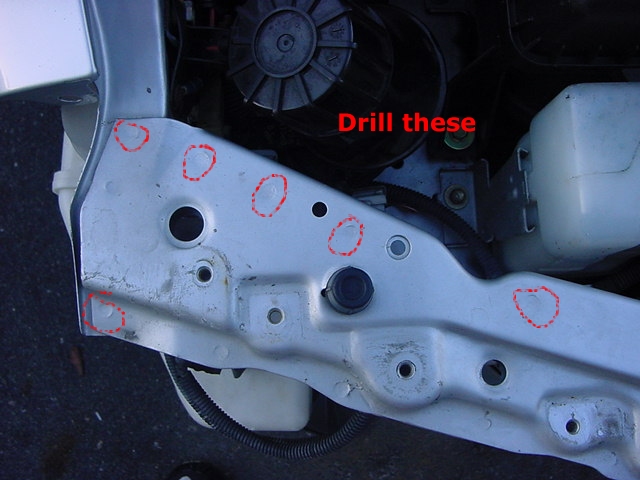 This makes it easier for the next step. Then turn the JDM headlight support upside down and drill out the spotwelds from that direction, so that you leave the JDM headlight support bracket undamaged.