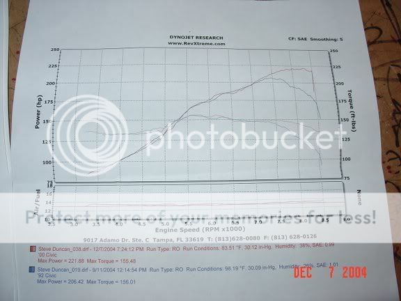 Well here ya go b20 vtec dyno chart for my drag car. 68mm tb, jg intake manifold, 310's (just to dyno i have bigger ones coming) endyn street port head, crower 63413 cams, skunk2 cam gears, stock valves, smsp b19 one piece header, msd ignition, 3 inch short ram w carbon fiber velocity stack, HONDATA. The car weighs 1,750 and last year i went 11.78 at 114.9mph with 219.8hp and 153.6 tq. The only things i changed this year was the tb, mani, header. last year i had typer tb, typer intake mani, dc jdm header. same long block!!! Graphs are from new manifold setup and car pics are from last year.