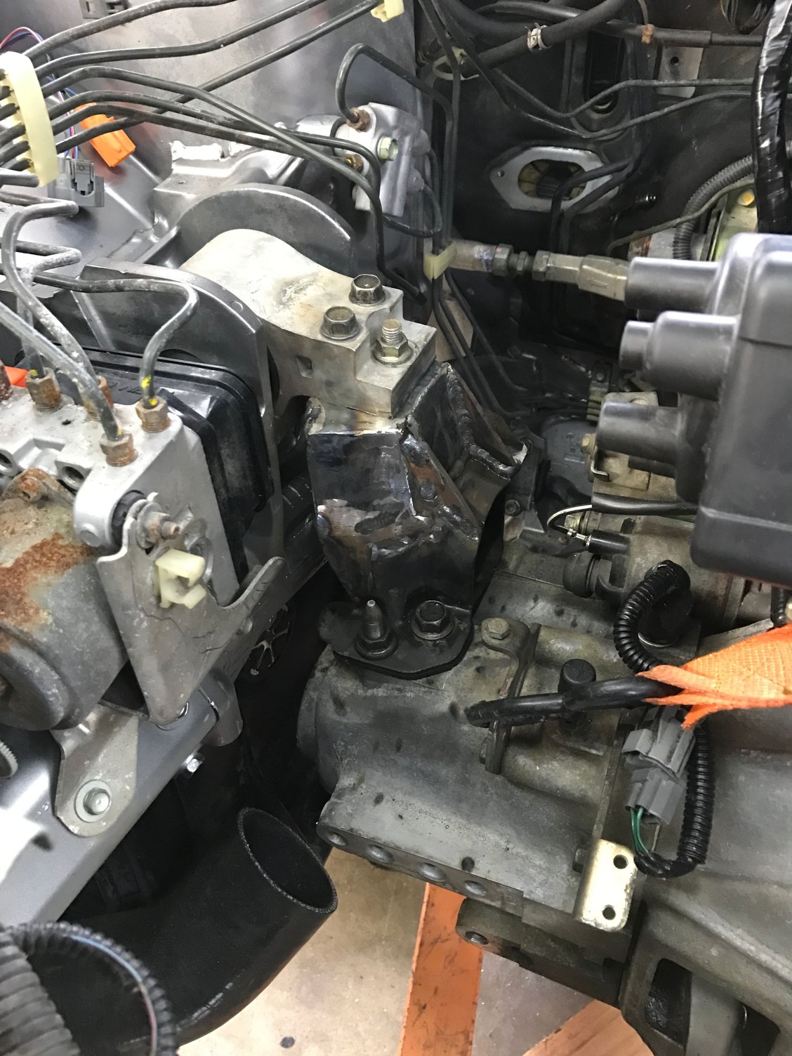 Both side mounts are done. Driver side mount uses an ek engine mount for y8/b16 so if I want to go b series down the road I would just need to build a b series t bracket, shift linkage and change the hubs to run b series size axles. Motor should be in tonight for good and start getting stuff hooked up.