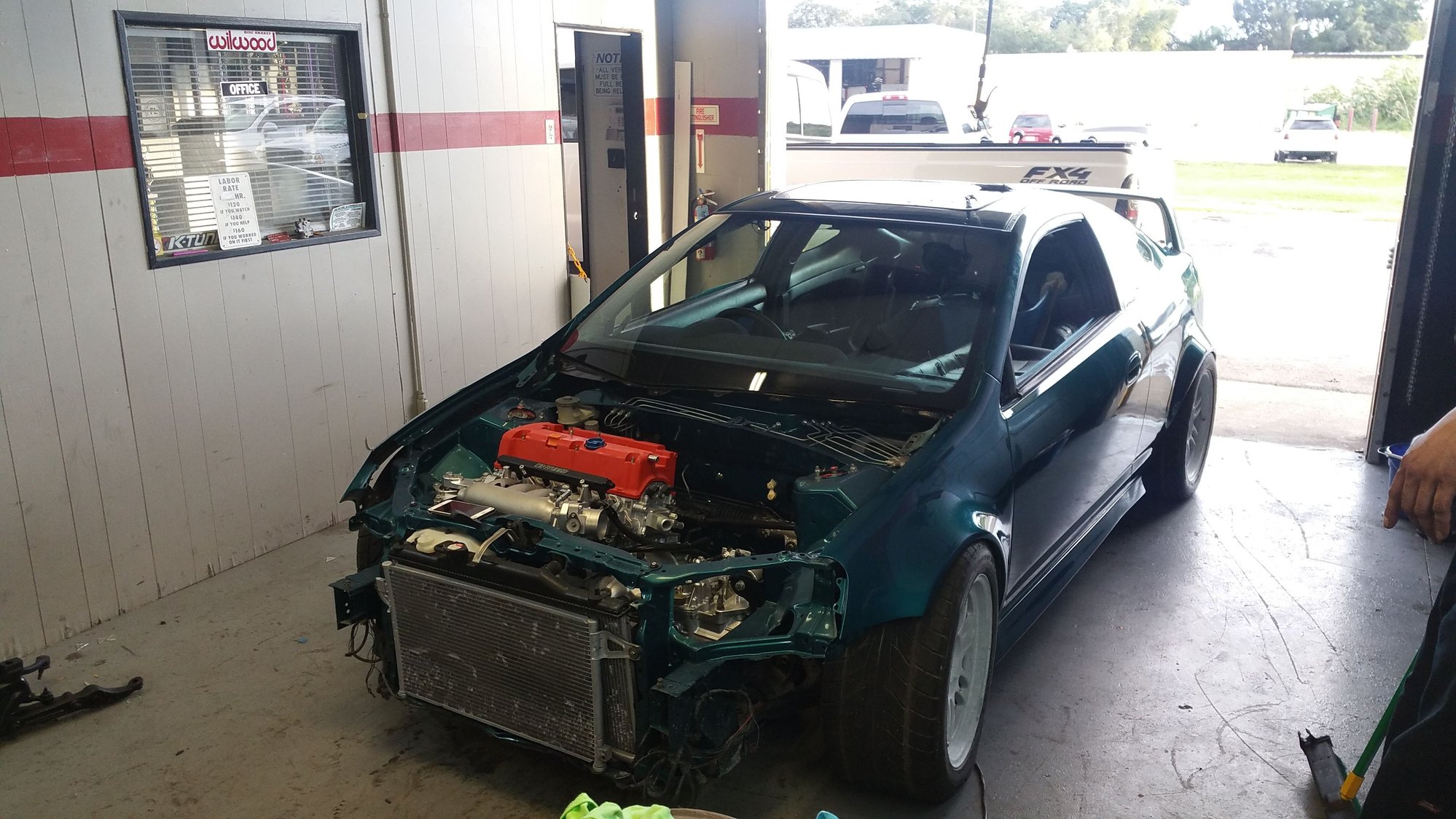Once back at the shop first step was to put all glass back to prevent more dirt to pile up inside the car from sitting at the shop. Shoutout to HCC AutoGlass for the hookup. God was she looking great. Now that I think about it, I should have kept that Wrinkle Red Type R valve cover.. Work work and work. Finishing up Fuel Set up along with some lines for the clutch. Catch Xul being Xul. 😂 After that, sent the wheels out for powdercoat, and tires to a friend to get freshened up and cleaned. They had so much overspray on em. Then WIRING came. ._.