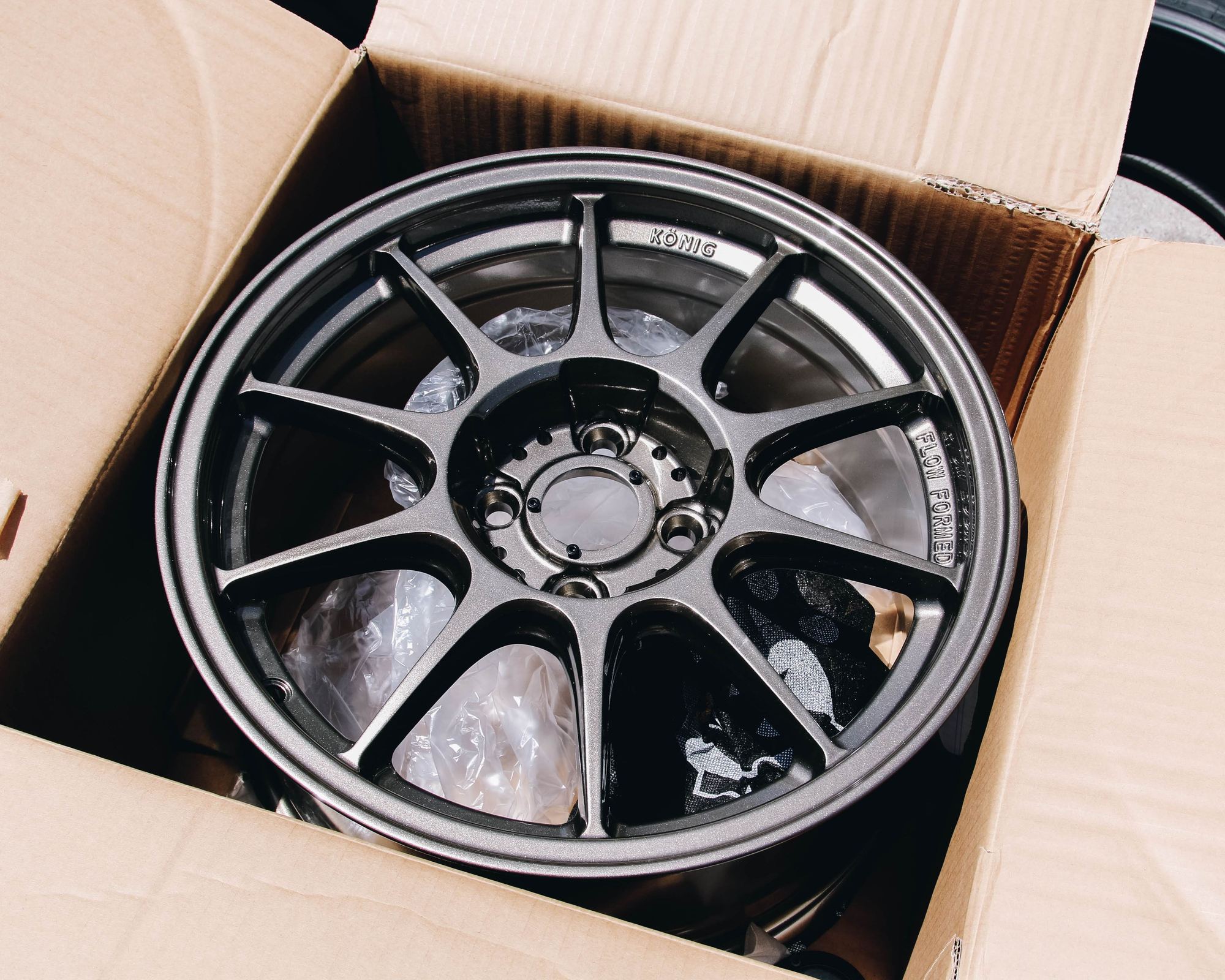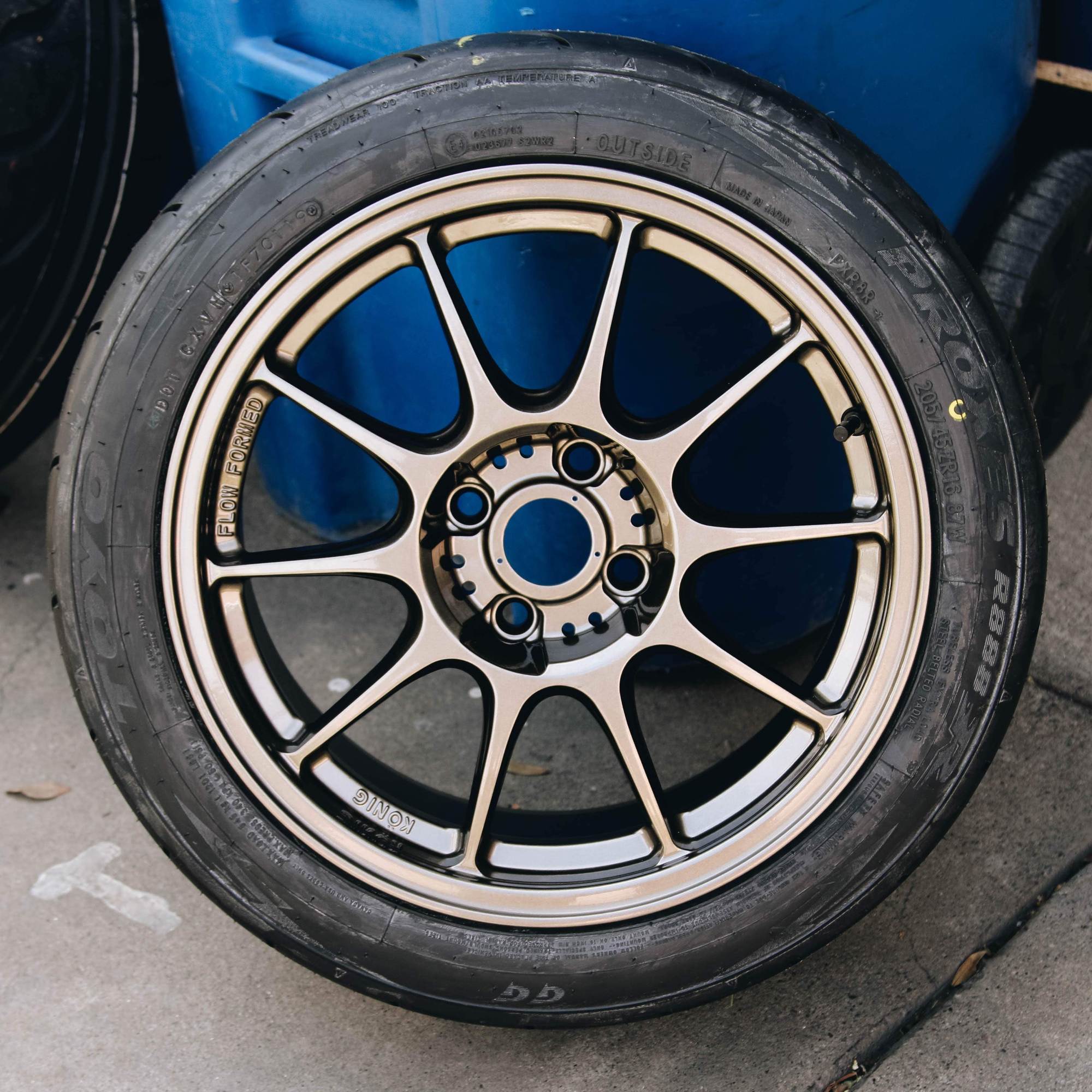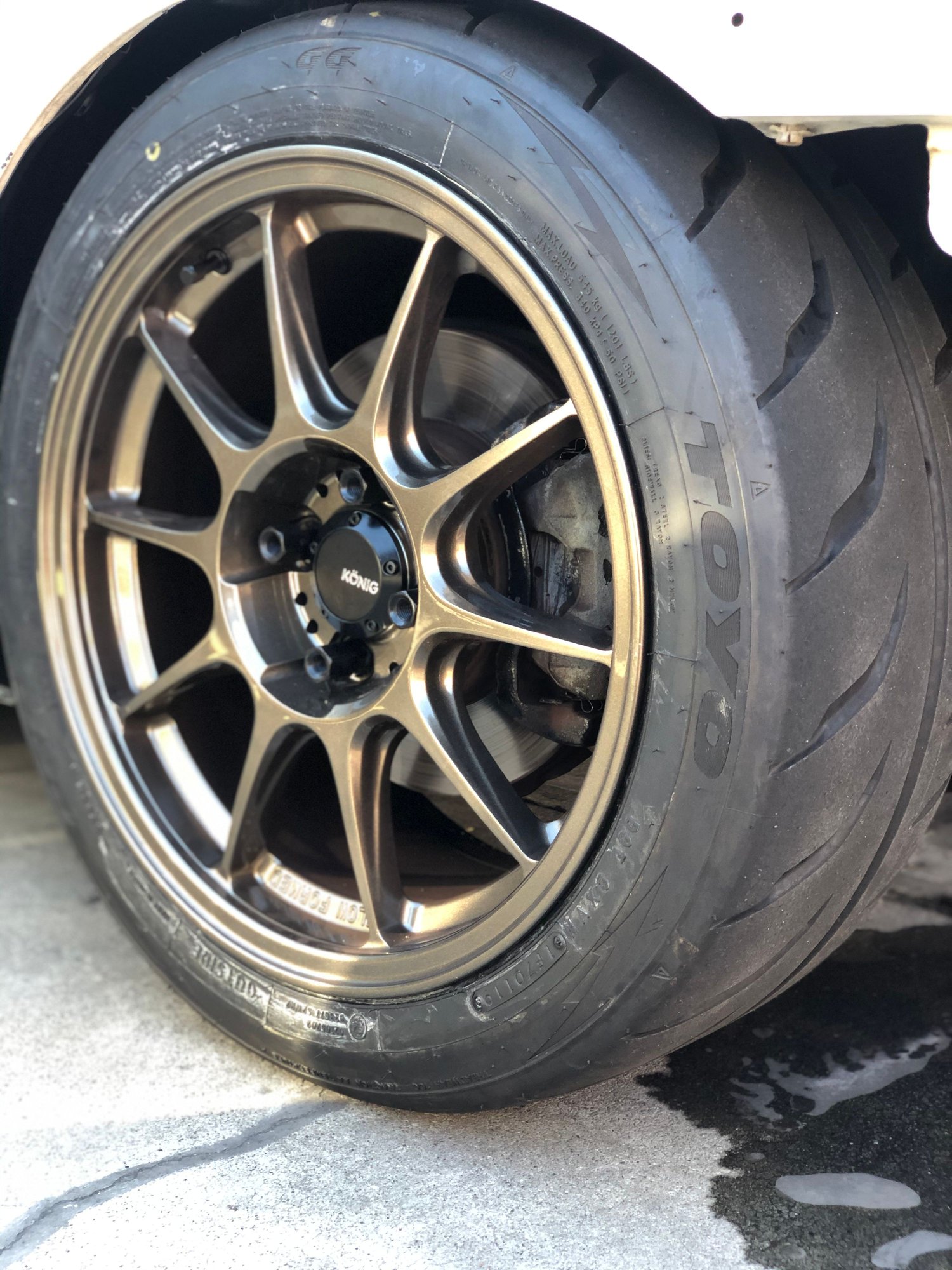 Needless to say, the Buddy Club P1 wheels were garbage. The offset were terrible and the 15 inch sizing was just not it for me. I ended up going with some Konig Dekagram wrapped in some Toyo R888R for track duty. The Konig Dekagram's are surprisingly pretty light and considering it was only $600 for a set of 4, I would say these are a steal! The reason I didn't get some TE37's yet is because I plan to eventually do a 5 lug conversion. After getting the tires mounted and balanced, I ceramic coated all four wheels with GTECNIQ C5 Wheel Armor. This will hopefully help keep these wheels looking clean and fresh!