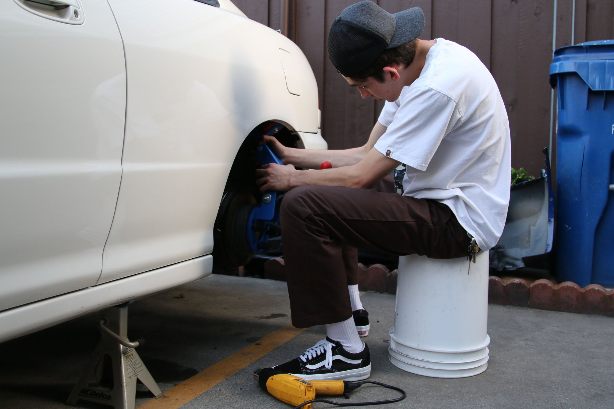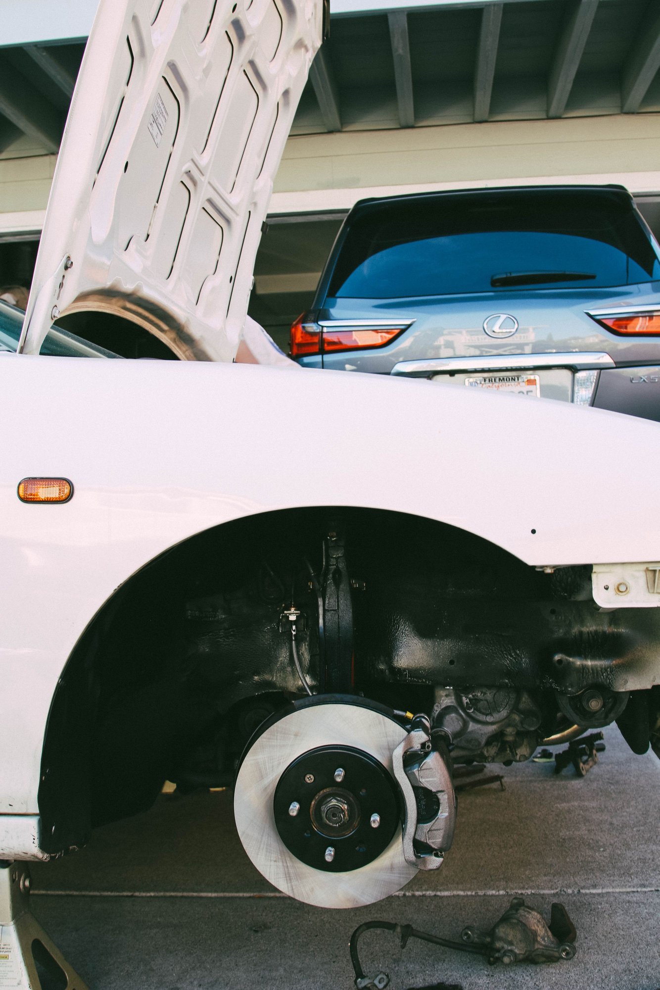 With the LMAs and Valve Stems replaced, I thought the VTEC would be fixed! However, the issue was still present. I decided to remove the catalytic converter and replace it with a test pipe. Boom! It was a clogged cat all along! Knowing this, it would've saved me a lot of money but hey, the car is more refreshed now! After fixing the VTEC and changing the LMAs, next up were the brakes. The old brakes were warped and making a lot of noise. The pedal feel and dirty brake fluid meant it would for surely not last at ALL during track days. To combat this, I purchased Hawk HPS Track Pads, New Rotors, GoodRidge Stainless Brake Lines, and StopTech Brake Fluid. This combination gave the car a FIRM brake feel that helped the car stop a lot faster. The install was relatively straight forward until we put the stainless lines on. We needed to put "2" cooper washers on the caliper side instead of one washer... The lines never came with instructions and as a result, I paid the price. I had to bleed the system TWICE!