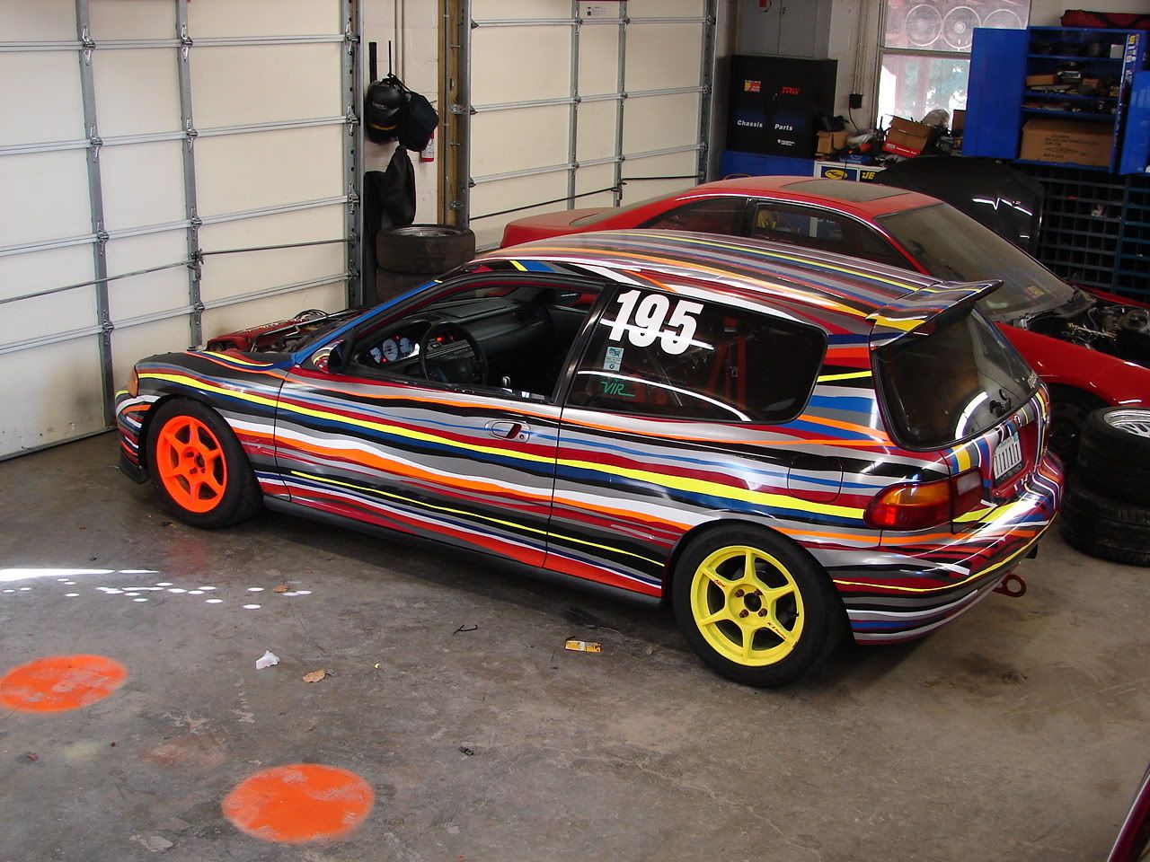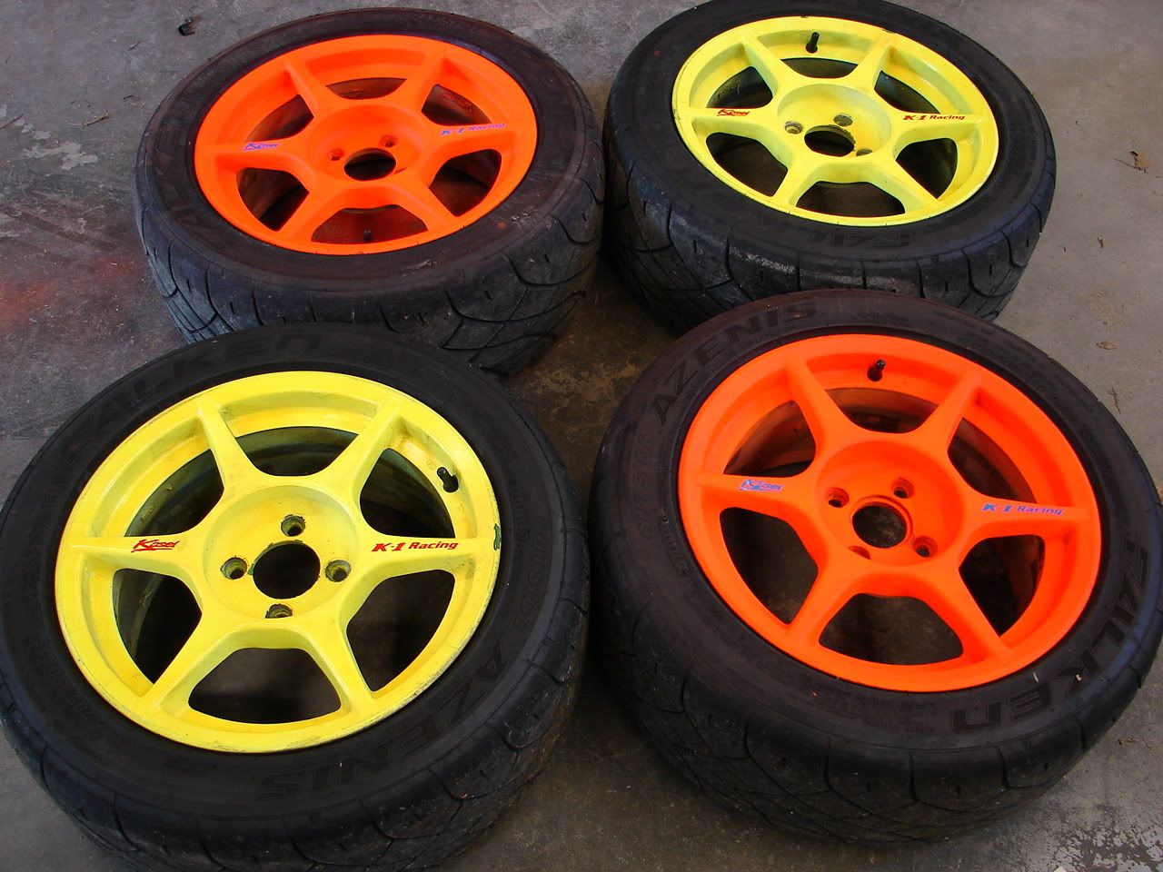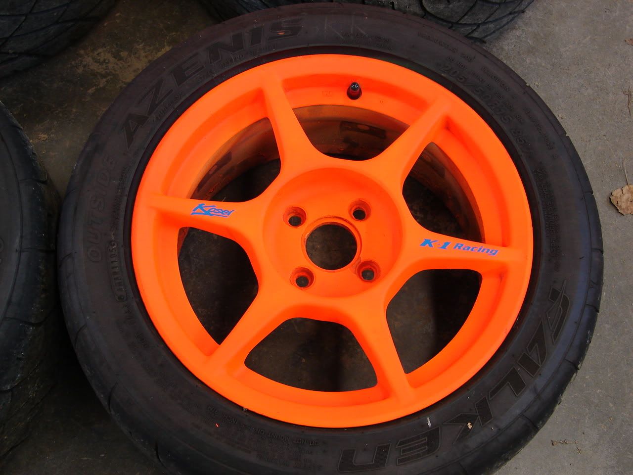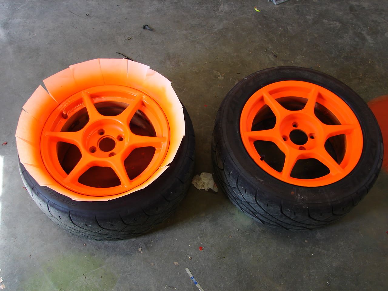 Car is now even more annoying.Two wheels painted safety orange.I have new Kosei stickers coming for these.Pics of them on the car next week.