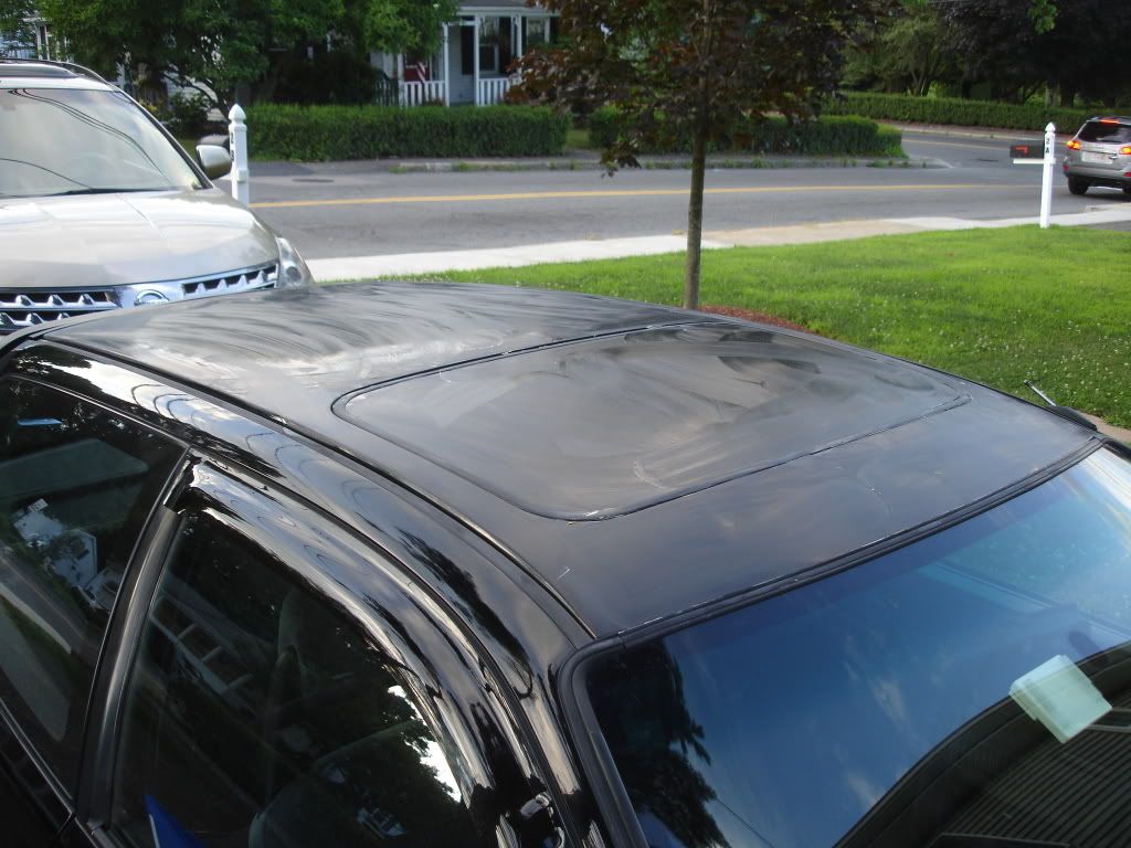 Next up was the roof. Notice I waxed the glass too. This was mainly for 2 reasons. A waxed car has a slippery surface which is good for making air go over it easier. By having the air slide over the car easier, this can improve the aerodynamics of the car, granted small as far as acceleration and turning, it does net substantial MPG improvements and secondly rain slides better on a waxed surface. That doesn't matter much since I have the shade closed during rain but for the windshield its very helpful. The moonroof was mainly to make it slippery.