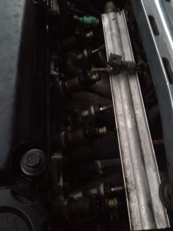 Then just remove the 3 nuts that hold down the fuel rail and the rail comes out and you can pull the injectors out.