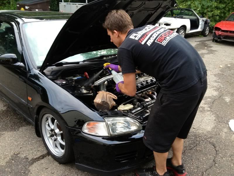EasyE asked if I wanted to powerwash my engine bay and I said hell yeah! Here he is spraying the bay with some sort of degreaser, not sure what it is exactly.