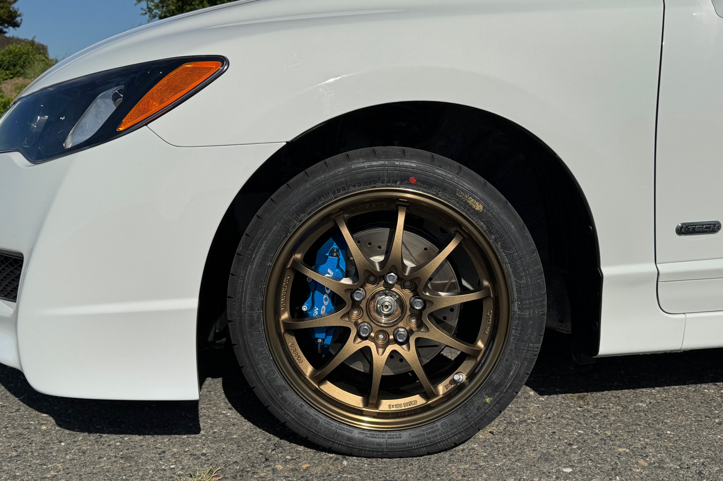 Then I got FD2 control arms, FD2 RRC crank pulley, using the same FD2 flywheel, clutch plate, and pressure plate from earlier, FD2 airbox and tube + resonator, FD2 fuel injectors. And then I finished it off with the smaller twin-block spoon calipers as it fit the stock brake discs! And got CE28N wheels to lighten everything up even more.