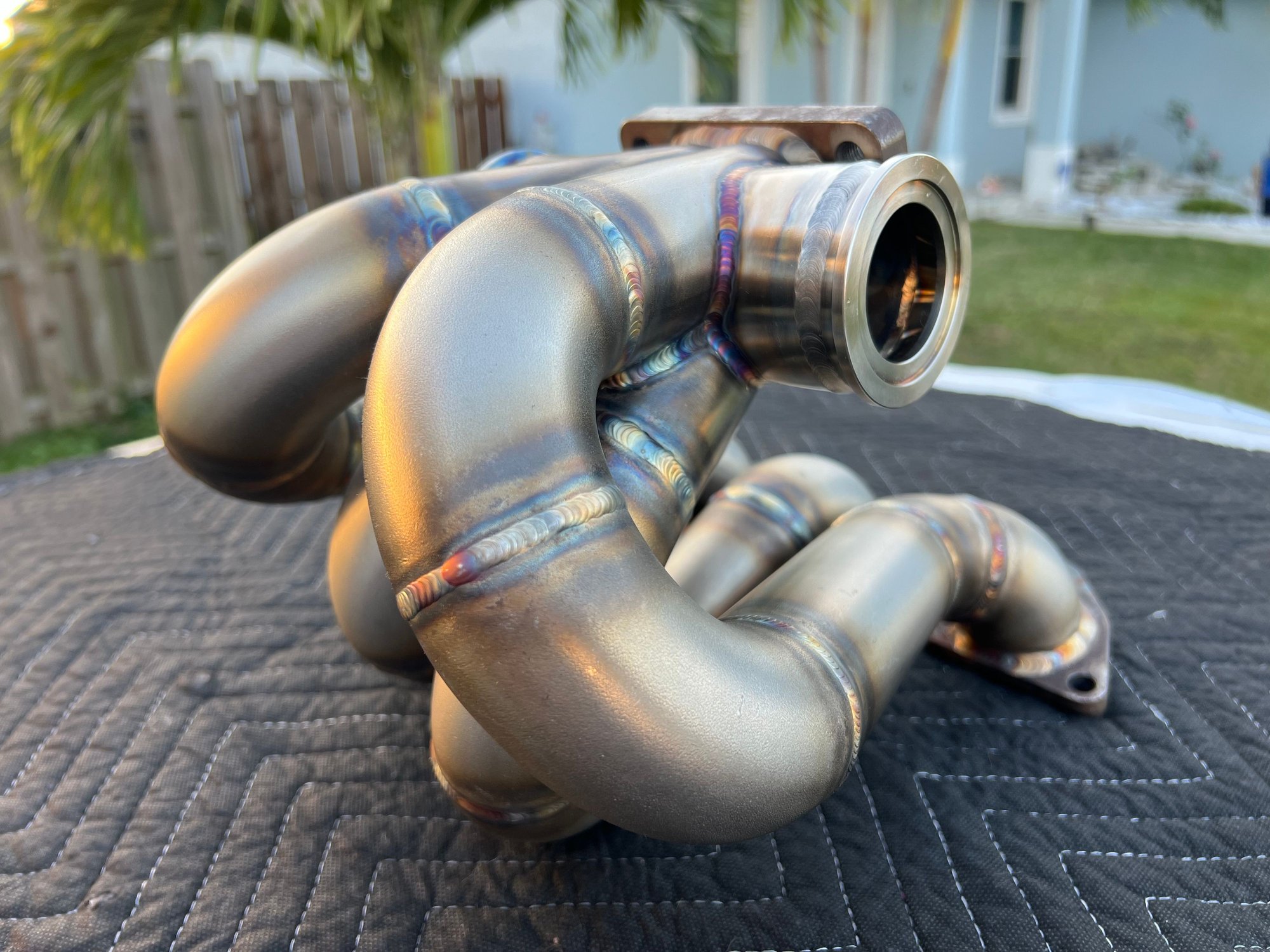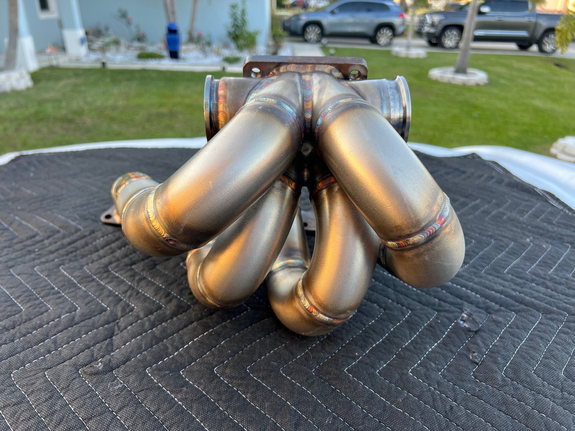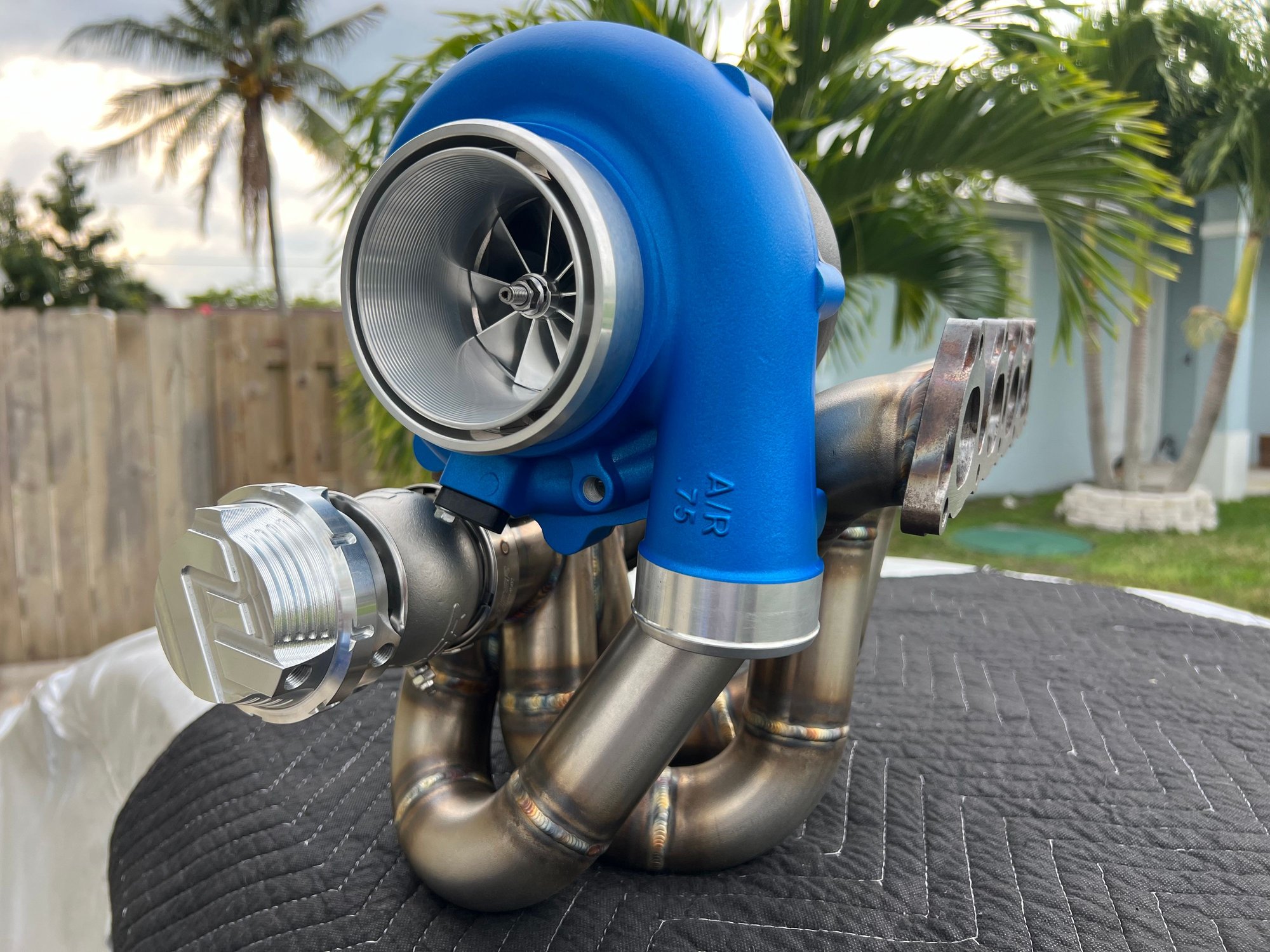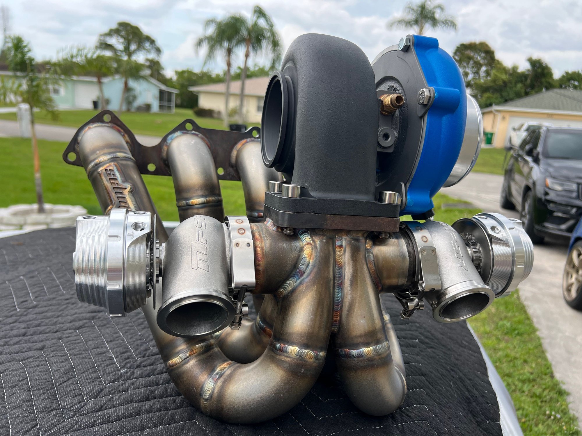 I got the top mount turbo manifold modified to run dual 45mm wastegate valves. My local Fab guy did a great job on it.