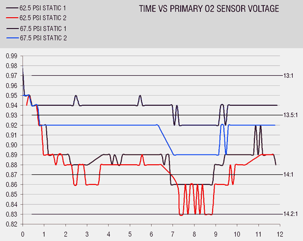 it's a 3rd gear pull from 2000-7000RPM. there was less than 1 minute between the two runs at the same fuel pressure, and about 30 minutes between the last 62.5 run and the first 67.5 run. based on this, what would you set the pressure at? i'm getting on the dyno w/wideband once i have something to tune out that nasty dip at the cam switchover, but until then i'm thinking 62.5 looks pretty good. the high pressures bother me (67.5 at full boost works out to +/-100psi on stock injectors.)