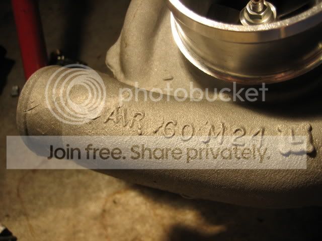 It's a T3/T04E it looks like , and has a .60 A/R turbine housing, .63 stamped on the exhaust side of it. The turbo inlet is 3" and the outlet is 2 1/2"