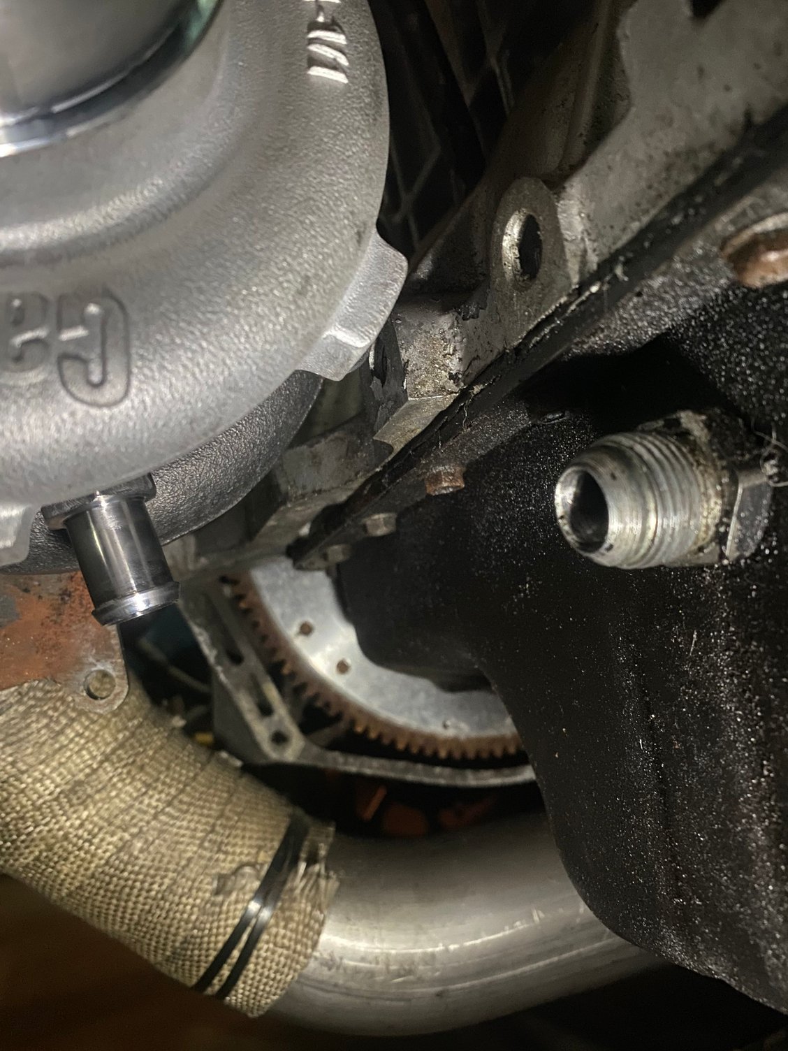 he could probably use (2) 60* fittings along with the oil drain fitting i mentioned. Since I switched it to those, no more oil back-up. It was bad enough I had to rebuild the turbo