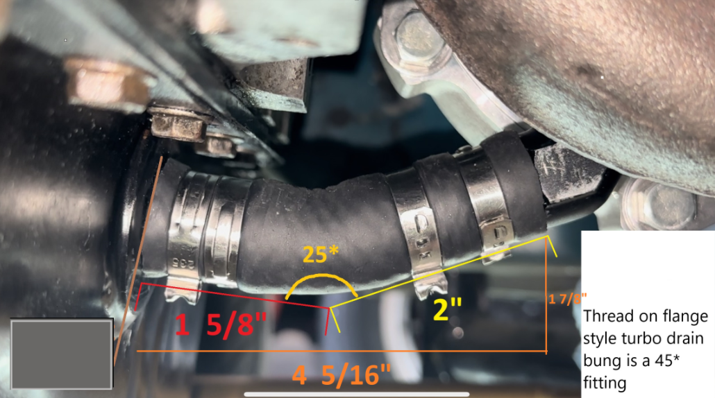 I've since re-worked it. I was able to get smaller turbo drain fittings that let me begin my slope toward the pan sooner. Seems good, less drips/no drips. Female threaded 2 bolt flange on the turbo, threaded in a hose barb to it. AN fittings were just too bulky