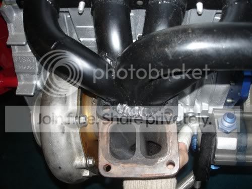 I had some time afterwork one day and hit the mill for a little action. I designed it real quick in Pro-E and took it to the mill. My turbo was a tangential discharge with a SFP manifold. I think this would work for his setup as well. It would put the turbo further away from the block since his compressor side is facing the passenger side. My compressor faced the driver side and I needed it closer to the motor.