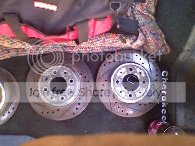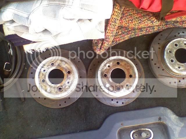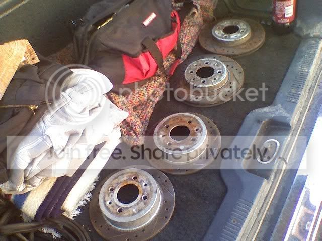 picked up some slightly used DRilled and sloted rotors for free, there rusty cause theyve been sitting for acouple of months on buddys DA he parting out, pperty sick for a FREEBIE!!!!!!!!!!!