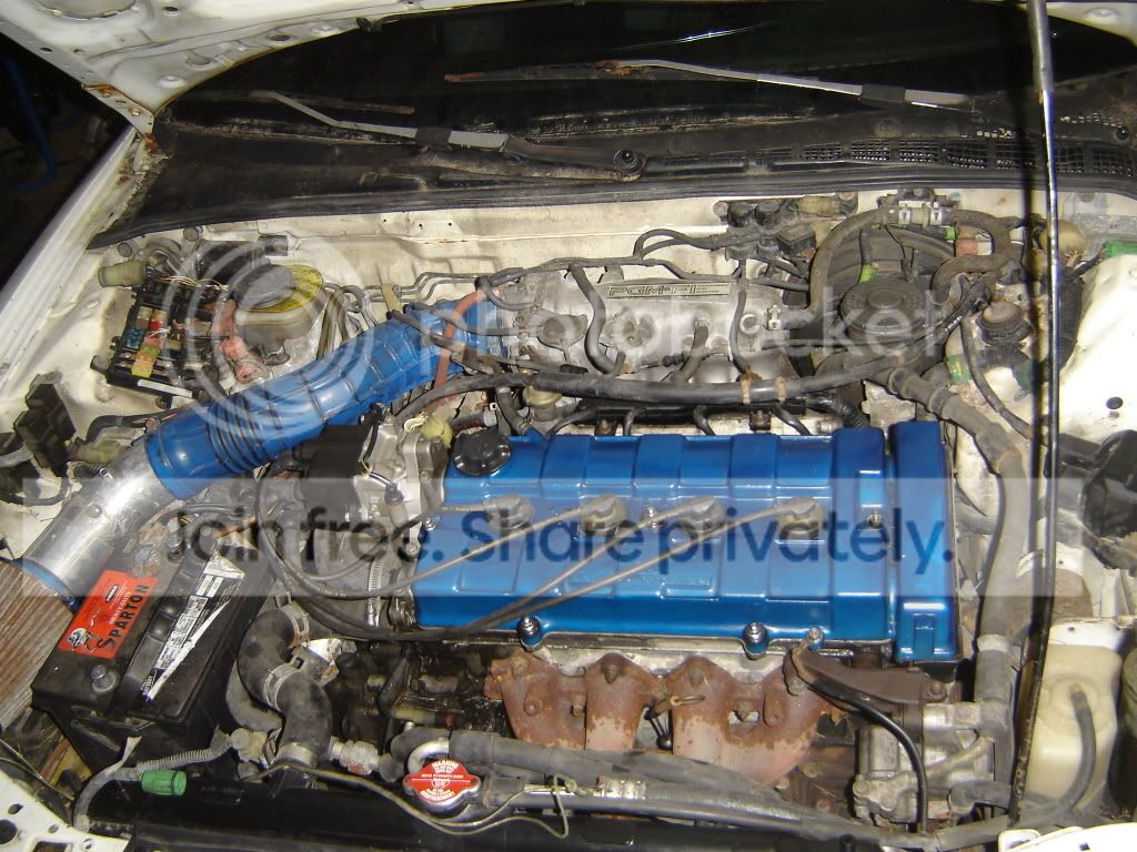Suspension & Brakes: cross-drilled rotors with performance ceramic pads, Earls S.S. brake lines and clutch lines, 2”lowering springs, KYB GR2 Struts, lower rear tie bar (Polished), Suspension Techniques front and rear sway bars (not installed), camber kit, c-pillar bar, rear strut bar, front strut bar, Swiss Cheesed" the front chassis under brace to lighten up the front, Blox Racing red lower control arms.
