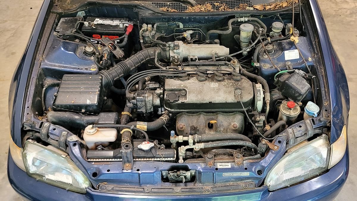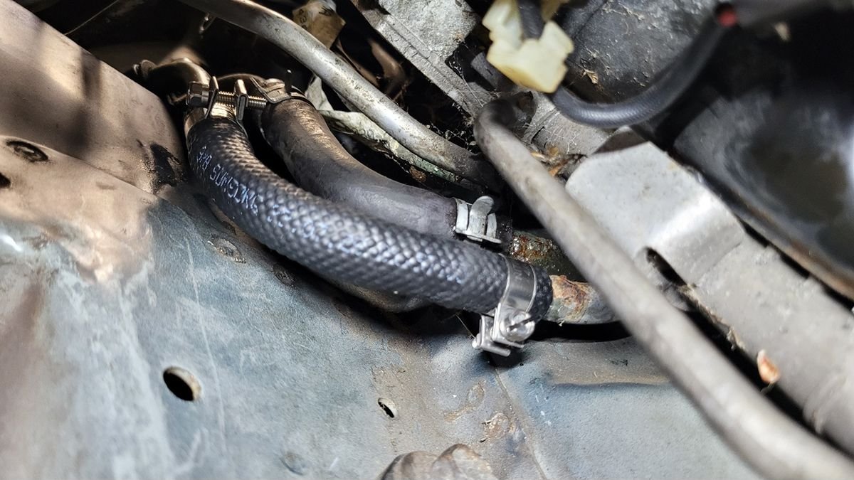 I got the car running over the weekend. There were a couple of setbacks. First, I wanted to replace the rubber hoses that run to the steering fluid cooler since they were starting to crack.. Honda doesn't sell them anymore and I wasn't able to find an aftermarket replacement. I checked the local parts store, but all they had was generic high pressure tubing for power steering, or softer rubber tubing for fuel or transmission lines. All of which had the correct 3/8" ID, however the OD was 5/8". The Honda hoses have an 11/16" OD, which seems to be an uncommon size, plus it needs to be flexible enough to make the bend without collapsing on itself. For now, I only replaced the lower hose and used some generic worm clamps until I can find something more suitable.