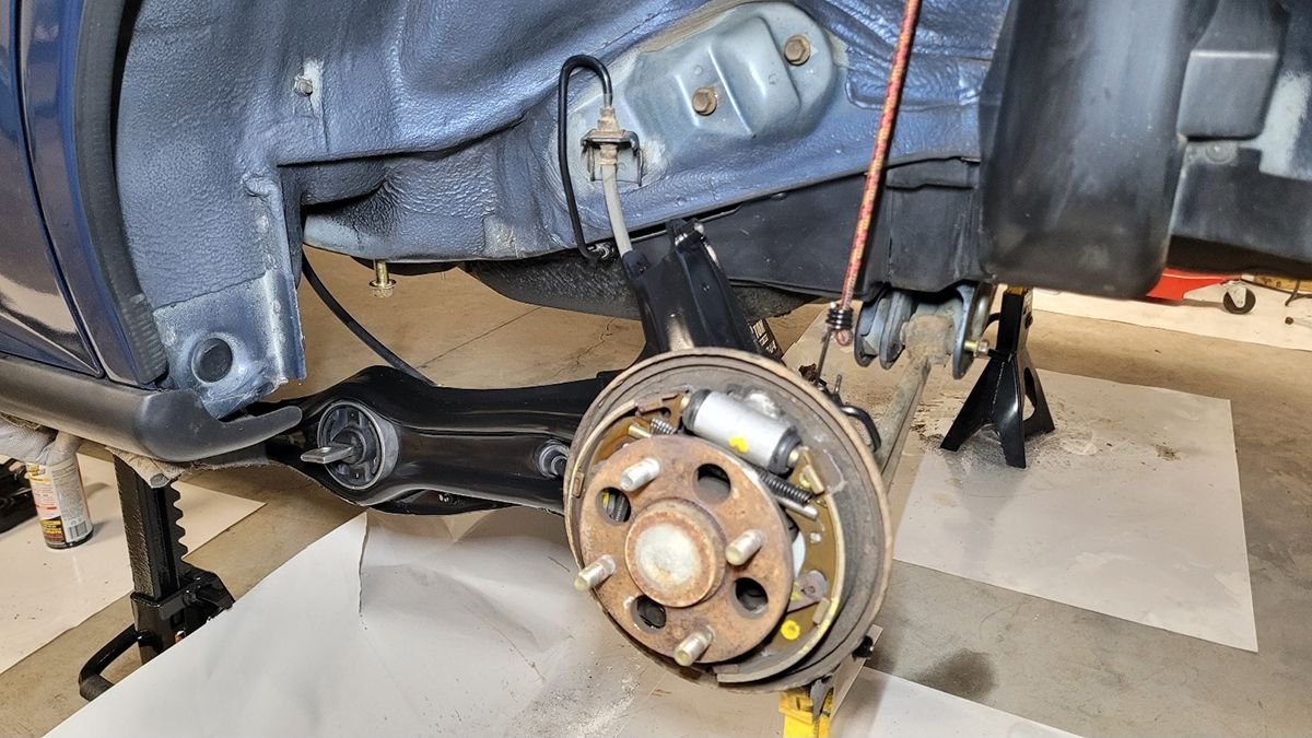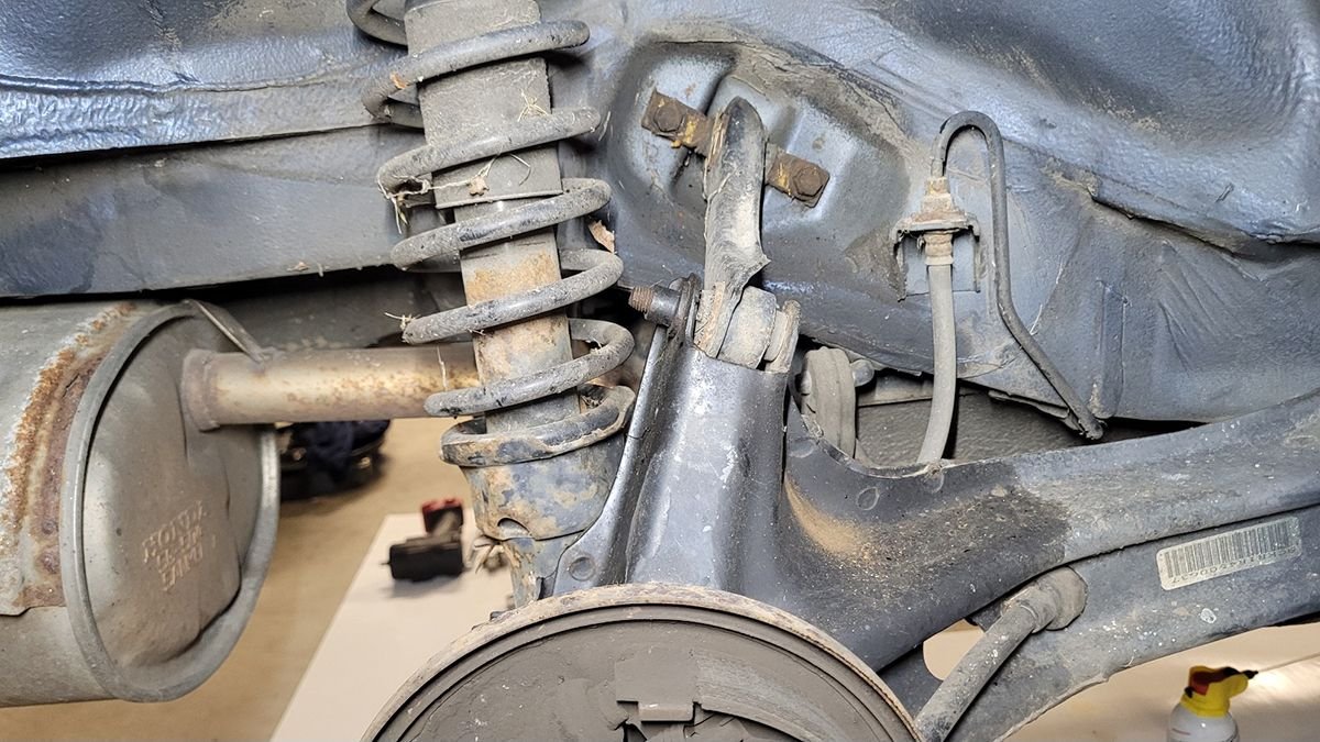 For the past week or so, I've been spraying a bit of penetrating oil on the bolts to the rear suspension. I really thought that the drivers side would give me the most trouble. Surprisingly, every bolt came loose without too much effort. The passenger side was far worse. I ended up breaking the bolt that holds the upper control arm to the trailing arm. Two bolts in the lower control arm were also seized as well the two bolts to the toe arm. None of the threads looked bad, so I'm guessing that they were seized inside the bushings.