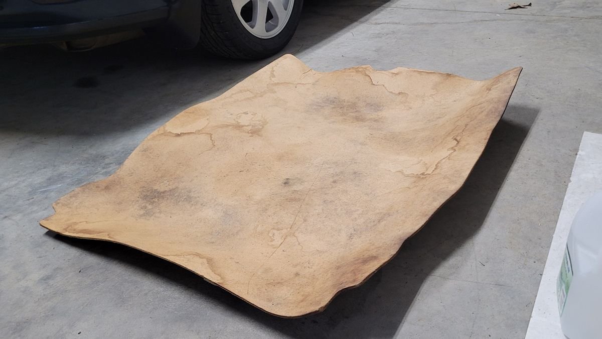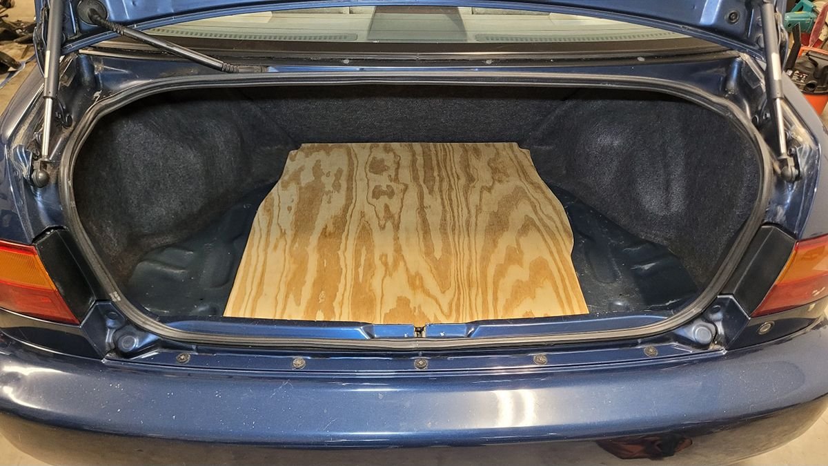I ran out to Lowes and bought a 4' x 8' sheet of 1/4" plywood to make a temporary replacement by tracing the OEM floor cover. Pine probably isn't the best choice for this, but it was relatively cheap and somewhat sturdy.