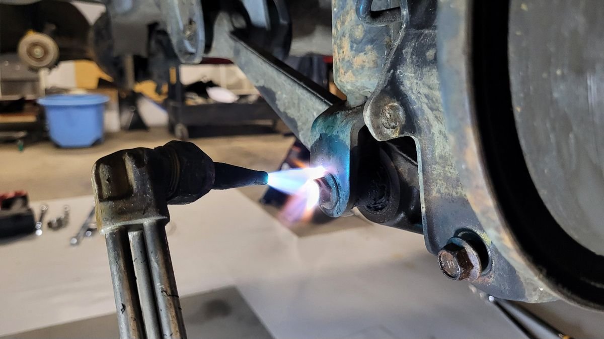 To remove the broken bolt, I'm going to try to heat it and then thread on a couple of low profile nuts onto the exposed threads. I think if I can get it loose, I might be able to spin it back through the nut. Worst case, I suppose I can just grind the nut off of the trailing arm and replace it with a standard nut.