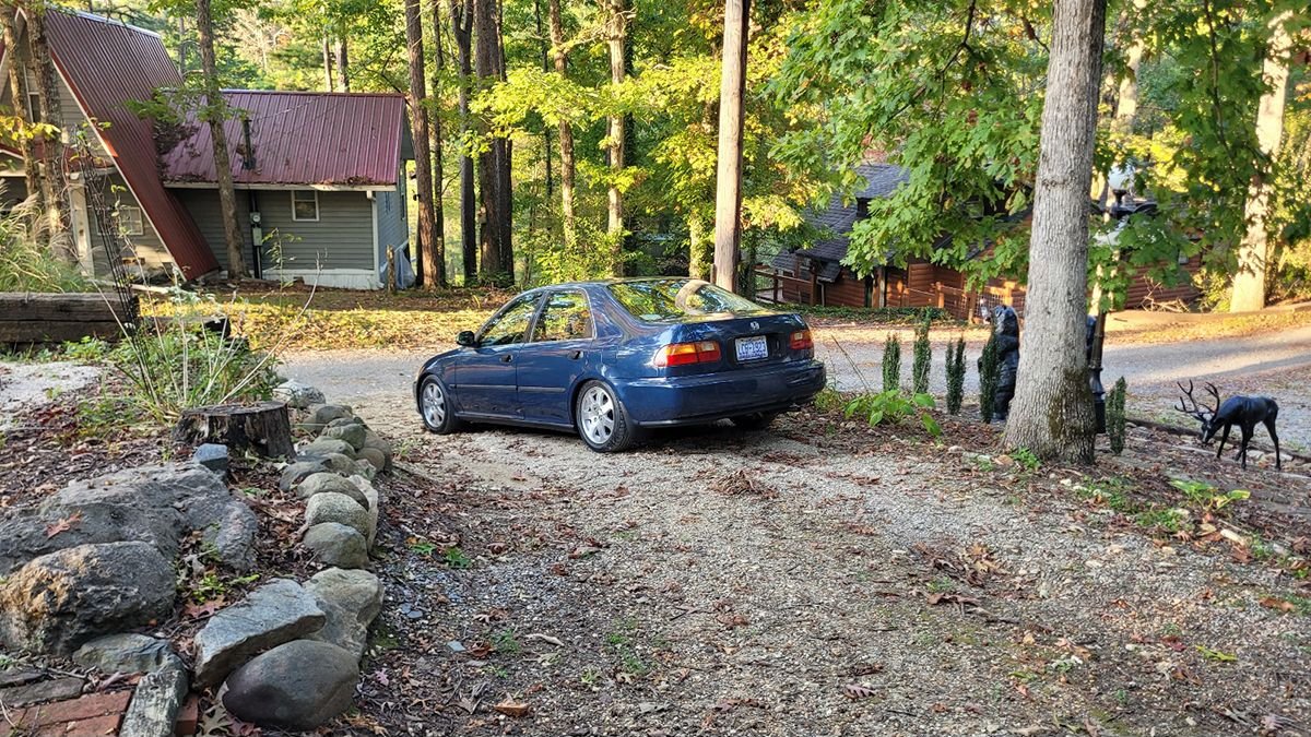 We weren't originally planning to stay the weekend so we had to make some last minute reservations for a cabin. Our normal spot in Bryson City was already booked, so we found a place in Tallassee, TN instead. Google Maps didn't have street view inside neighborhood otherwise we probably would have looked elsewhere. It was an extremely rough road made of a mix of dirt and gravel and littered with pot holes. At one point there was a treacherous downhill portion that was washed out. I thought there was no way that we'd get back out of there the following day. Luckily, the following morning we saw a couple of really nice 4th gen sedans leaving the neighborhood and followed them. It turns out there was a second entrance to the neighborhood that was much less tore up and it didn't include a massive hill climb.