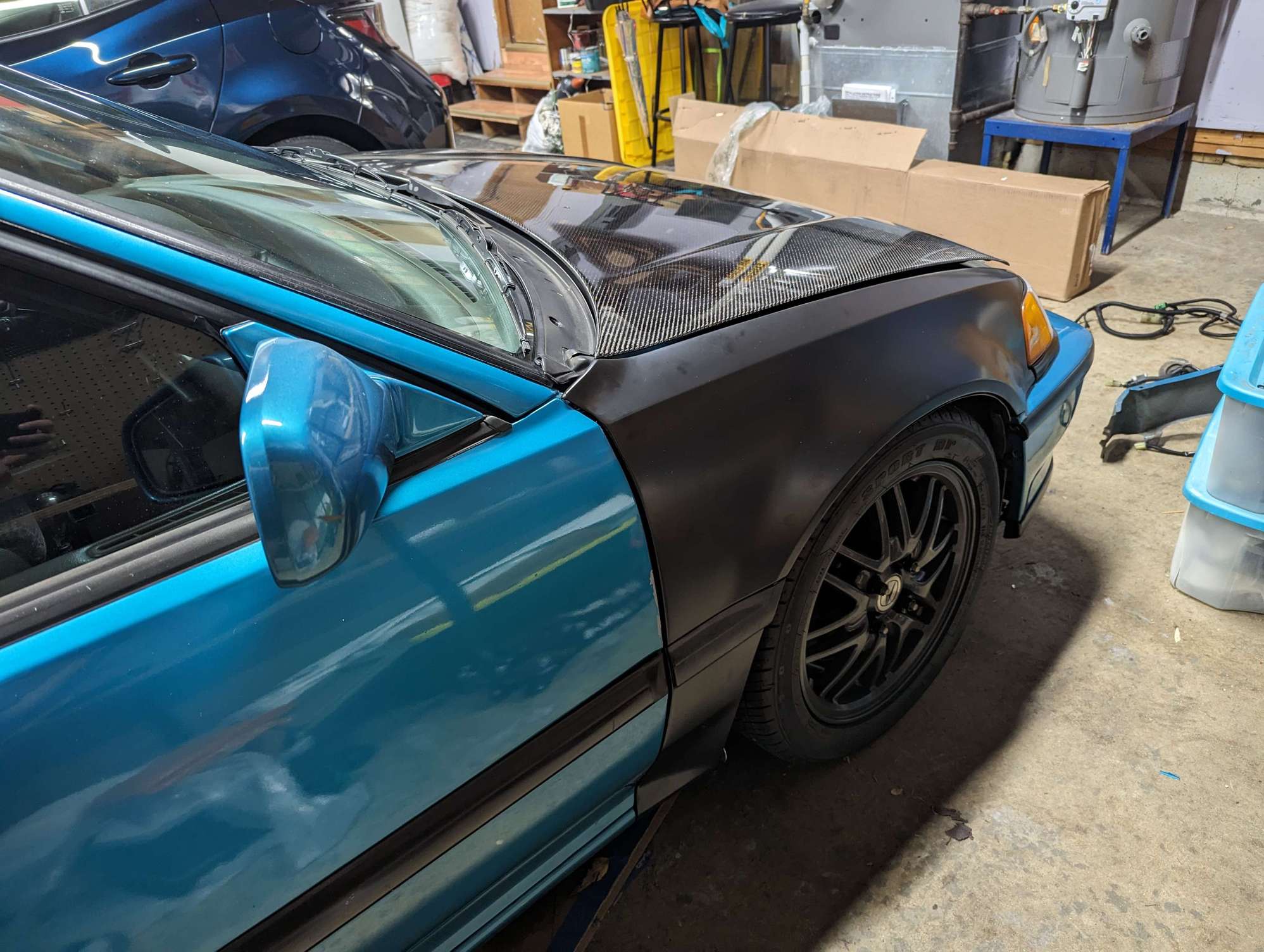 Exterior: - seibon carbon fiber hood - tracklife 1" vented two piece fiberglass fenders (not installed) - powder coated LS mesh wheels - password JDM smoked turn signals (not installed) - has a replacement front bumper filler trim and passenger fender from a previous accident - needs some paint and body work, and panel alignment, - rust free, has been garaged and on the west coast for most of my ownership of the vehicle
