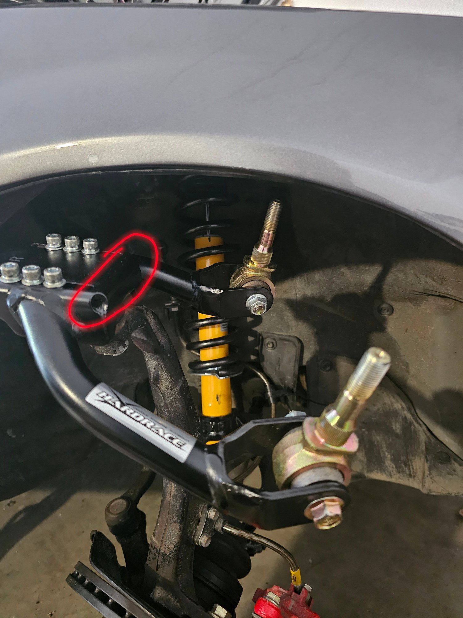 Now, with the kit the camber is correct, but when driving through some deeper holes the Hardrace UCA are hitting the shock tower (marked the spot on the picture).