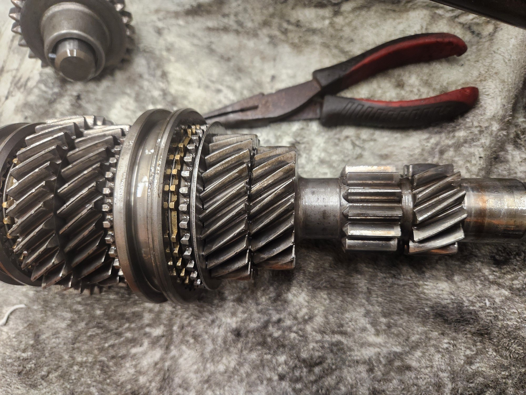 The only part that noticeably needed replaced was the bearing I mentioned which caused it to pop out of certain gears (mostly second and fifth), but third gear worked fine before taking it apart. This picture isn't perfect since I had to hold my phone in one hand, but I measured it with both hands after and got almost the exact same measurement, give or take .01 mm