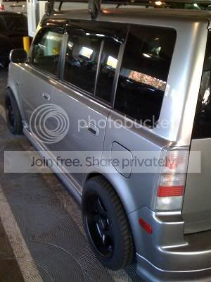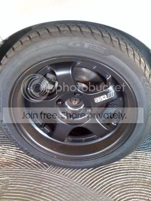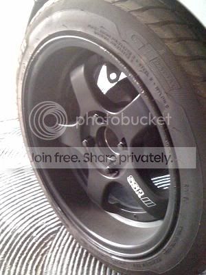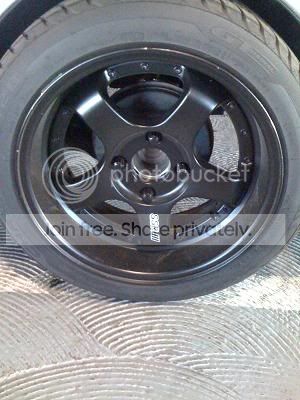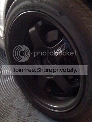 i have shitty pictures of these wheels and theyre dirty with brake dust but you get the idea. im pretty sure these specs are right: 16x7 (+13) front and 16x8 (+20). i might be wrong about the fronts, they could be 7.5 but everything else is right. i stripped them and painted them semi gloss black. one wheel has some curbage (bought like that), which you can see in the picture, but the rest are in great condition. they are 4x114 so im running spacers/adapters right now. the spacers are 25mm front and 50mm rear. i know thats pretty ridiculous, and the poke may be a little much for some peoples taste but i like it. the tires are cheap but only a few months old 195/50/16.